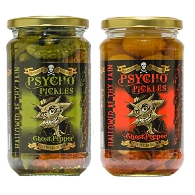 Psycho Juice Pickles Combo Ghost Pepper Pickled Onions and Gherkins