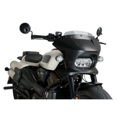 Made specifically for the Harley-Davidson Sportster S, its Batwing style design, inspired by the sharp snout of white sharks, sports a very marked horizontal line that lights a practically flat upper area that integrates with the tank and the set of the motorcycle; therefore, it is for those riders who seek to combine aesthetics and functionality in equal parts With the installation of the Fury semi fairing, the amount of air that would impact the rider is reduced, diverting the air cleanly to the sides, avoiding annoying turbulence, which considerably increases riding comfort and reduces fatigue Made with quality materials, ABS plastic and 4 mm thick CN acrylic material, it is a very resistant and rigid piece as well as light with resistance to impacts and aging; it has approval by the German TUV The shell is available in matte black or glossy black and can be combined with the Sport visor, more aggressive and minimalist, and the Touring visor, er to provide greater aerodynamic protection, available in clear, smoked, dark smoked and black; to be able to choose the combination that best suits your style Check compatibility with your motorcycle in the Product Description section