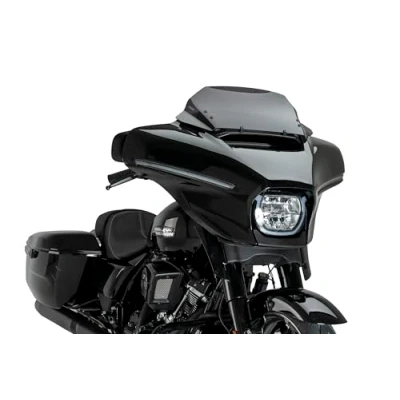 Compact and aerodynamic windscreen designed for original semi-fairings, ideal for urban commutes and short trips, providing a balance between protection and aesthetics without compromising rider mobility. Manufactured from high-quality 4mm acrylic, offering maximum transparency and impact resistance. Its side shapes are designed to deflect air from the shoulders and enhance riding comfort. Reduces aerodynamic pressure by 63% compared to the original screen, decreasing rider fatigue. Available in transparent, light smoked, dark smoked, black, and matte black colors. Quick installation in just 7 minutes without the need for mechanical knowledge. Includes mounting instructions and is certified with ABE and TÜV approval for legal use on public roads with total safety. Compatible motorcycles: Harley Davidson Street Glide FLHX 2024.