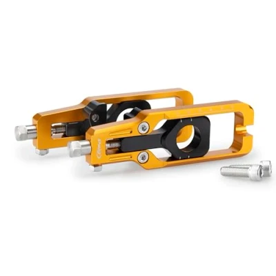 Puig 22204O Chain Tensioner; precise and sporty design; made of machined anodized aluminum; easy adjustment with visible markings; perfect aesthetic integration swingarm, Gold