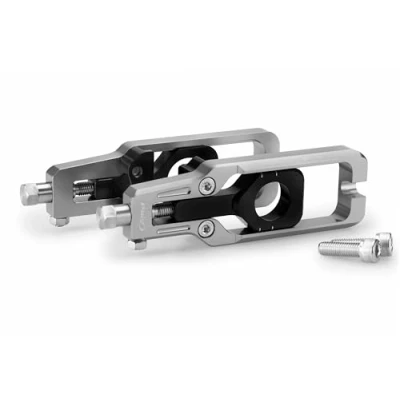 Puig 22204P Chain Tensioner; precise and sporty design; made of machined anodized aluminum; easy adjustment with visible markings; perfect aesthetic integration swingarm, Silver