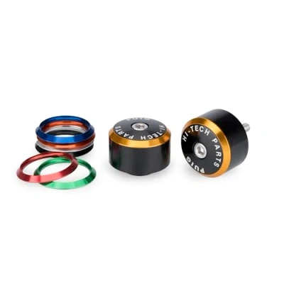 Puig 22239N handlebar end weights in black with sporty, customizable design; made of high-quality aluminum for strength, lightness, and a modern look for your motorcycle. Composed of three pieces: central body, interchangeable color ring, and cap with Hi-Tech Parts engraving; the set includes 12 rings (2 per color) in blue, black, gold, silver, orange, and red for full customization. Easily installed by replacing the original handlebar end weights; requires no modifications, allowing you to refresh your bike’s style quickly, easily, and without technical hassle. They add a decorative and functional touch thanks to their 20-gram weight; help balance the handlebars, improve riding comfort, and reduce vibrations on long or urban routes. Compatible bikes: APRILIA RS 457 2024; APRILIA RS 457 2025.