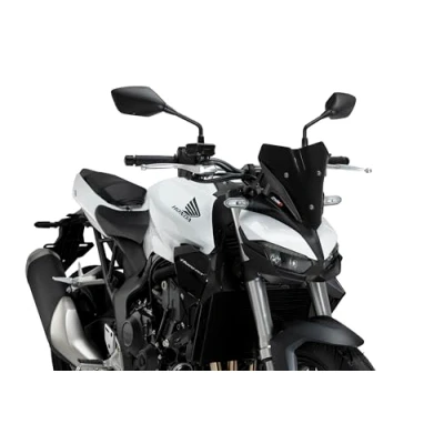 Puig New Generation Sport Windscreen 22381N in black finish, made from 3 mm PMMA, impact‑, UV‑ and scratch‑resistant; enhances the motorcycle’s aggressive, sporty aesthetic. Design inspired by fighter jet aerodynamics; reduces wind impact on the rider and channels airflow to non-critical areas, offering comfort without sacrificing racing style. Compact and efficient: with 260 mm height and 245 mm width, it extends just 35 mm above the instrument panel, keeping a clean and optimized front; includes anti-corrosion metal brackets. Fast and easy installation with no technical knowledge required; direct mount with included instructions; includes aerodynamic study and complies with TÜV and ABE road-use approval. Compatible bikes: HONDA CB1000 HORNET 2025; HONDA CB1000 HORNET SP 2025.