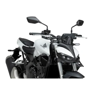 The Puig D12 winglets are designed to optimize your motorcycle’s aerodynamics; their double-wing profile channels air upward, generating greater downforce without affecting the drag coefficient; increases stability. Its innovative design with a lateral winglet provides up to 4.4 kg of downforce on the front axle; delivers an anti-wheelie effect, greater stability under braking, and improved cornering performance; ideal for sport and high-performance motorcycles. Made of 4 mm CN acrylic with rounded edges; include 2 mm metal supports with a textured black finish; their construction combines lightness, strength, and sporty aesthetics; compliant with TÜV quality and safety standards. Installation is quick and easy; requires no mechanical knowledge or special tools; installs without drilling and comes with clear instructions included or available online; designed and manufactured entirely in Barcelona by Puig. Compatible motorcycles: HONDA CB1000 HORNET 2025; HONDA CB1000 HORNET SP 2025