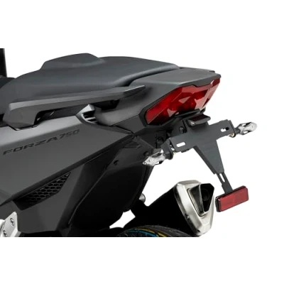Replaces the original license plate holder with a sporty design thanks to its raised position, improving overall aesthetics and providing a cleaner, more dynamic look without compromising functionality. Assembly manufactured by combining steel components with epoxy paint finish and polyamide elements, achieving a significant weight reduction compared to the original holder while ensuring strength and durability. Fixed or tilt-adjustable license plate holder depending on the model, with integrated locking system that secures the selected position during riding, maintaining stability and regulatory compliance. Includes a kit consisting of an approved license plate light and reflector, as well as an adjustable turn signal holder, allowing reuse of the original turn signals and license plate light depending on the configuration. Compatible motorcycles: Honda Forza 750 2025–2026.