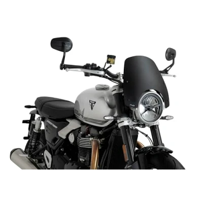 Refreshes the motorcycle’s appearance with a 320 x 325 mm sporty fly screen positioned 40 mm above the instrument cluster, offering frontal protection and a perfectly integrated modern style. Manufactured in 3 mm high-impact acrylic, offering excellent resistance against potential impacts and outstanding aerodynamic performance, remaining stable under wind pressure and intensive use. Developed and wind tunnel tested to optimize airflow and reduce turbulence, improving stability and comfort in urban riding and at higher speeds. Simple installation and precise fit to the compatible model; includes detailed instructions and may feature KBA and ABE homologation depending on the reference, complying with TÜV requirements. Compatible motorcycles: TRIUMPH SPEED TWIN 1200 2025; TRIUMPH SPEED TWIN 1200 RS 2025; TRIUMPH SPEED TWIN 900 2025.