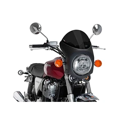 Retro motorcycles are in clear boom these days and Puig recognizes It. Therefore, it has designed a new Retro semi-fairing to protect you from the wind and in turn enhance the vintage image of your jewel. Manufactured in ABS, material Highly resistant to possible impacts, It will perfectly fulfil the function of protecting US from wind Gusts and possible inclement weather, making our riding experience in full comfort And enhancing the retro aesthetic line of the machine. The piece is composed of an opaque body, with a matt black or carbon-like Finish and a clear, Dark, black or transparent Smoked screen. Puig has two types of fairings depending on the diameter of the headlight of your bike: 195mm or 180mm. In addition, Puig has created for the most popular models, a support with a specific adhesive kit. If you need a universal model, Puig has a mounting kit that allows you to attach the piece to various motorcycle models. The retro Puig semi-fairing has been tested by the German TÜV, and has the ABE 39524 certification.