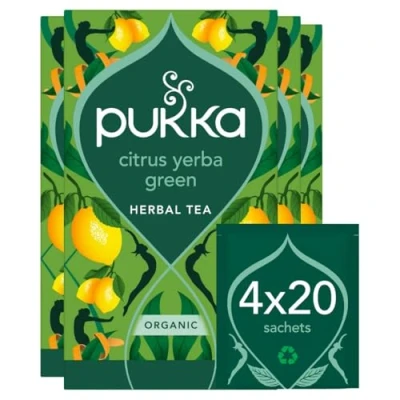 Pukka Herbs, Citrus Yerba Green Tea, Organic, Herbal Tea Box [4 Boxes of 20 Bags], Boosts Natural Energy & Focus, 80 Plant Based Biodegradable Bags