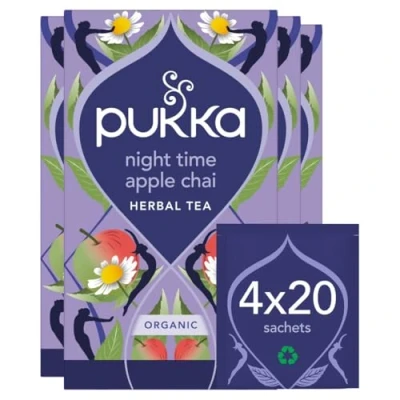 Pukka Herbs, Night Time Apple Chai Organic Herbal Sleep Tea Box [4 Boxes of 20 Bags], Natural For Bedtime Relaxation, Caffeine Free, 80 Plant Based Biodegradable Bags