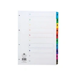 White 10-part index for A4 binders with numbered tabs. Mylar-reinforced holes and tabs to resist damage. Pre-printed index page with colour-coded tabs numbered 1-10. 4-hole punched spine fits most A4 ring binders. Format: A4 (297 x 210mm).