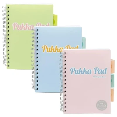 JoybuyThe Pukka Pads A5 Pastel Project Book (Pack of 3) features 200 pages of high-quality lined paper, 3 repositionable dividers with storage pockets, perforated pages for easy removal, and a durable wipe-clean cover—ideal for organized, portable note-taking at school, work, or on the go.