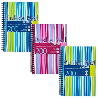 Pukka Pad, Striped Jotta Pad A5 Notebook 3 Pack with Twin Wire Binding 200 Pages of 80GSM Paper 8mm Lines and Perforated Edges Assorted Colours, 21 x 14.5 cm