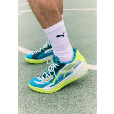 Puma ALL PRO Nitro Dreamz Unisex Basketball shoes tropical blue/peaceful blue Sale at Zalando UK | Upper material: textile/synthetics/Lining: textile/Sole: synthetics/Insole: textile | Sale order at Zalando UK! Size: 9.5. Color: Tropical blue/peaceful blue. Pattern: print.