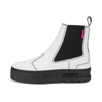 PRODUCT STORY For the hype girls, the street enthusiasts, the trend setters – the Mayze Chelsea. This stand-out model has a stacked sole and a classic boot upper for a look that makes a statement, however you choose to style it. DETAILS : Leather upper Rubber outsole Elastic panel on the quarter PUMA Wordmark on the heel and midsole Woven tab with PUMA No. 2 Logo on the quarter