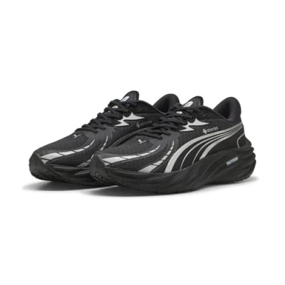 Color: Classic black design for versatile athletic style Waterproof Technology: GORE-TEX membrane keeps feet dry and warm while maintaining breathability Cushioning System: Full-length NITROFOAM midsole with nitrogen-infused foam technology for enhanced energy return Traction: PUMAGRIP outsole made of durable rubber compound for reliable multi-surface grip Design Features: Regular fit with rounded toe and lace-up closure for secure fit Technical Specifications: 10.0mm heel-to-toe drop with stack height of 36mm/26mm for neutral support Sustainable Materials: Upper constructed with 20% recycled materials for environmental consideration