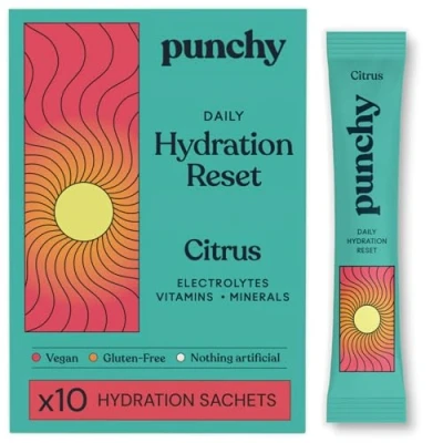 💪 GET BACK ON TRACK - Reset your hydration with our game-changing wellness blend, featuring 7 essential electrolytes & minerals and 5 immunity-boosting vitamins. Crafted to refresh, restore and get you back on track for the next chapter of your day. 💦 GOOD HEALTH STARTS WITH HYDRATION - Most people are dehydrated without realising it. With many of us struggling to meet our daily water quota it can leave us feeling depleted in energy and focus so punchy’s nutritionist-approved range is a supercharged way to meet your needs. 😎 WORK, TRAVEL OR PLAY - Perfect for when you’re on-the-go, for a daily wellness fix, post-workout, recovery day or after party. Say goodbye to brain fog, tiredness, muscle fatigue and poor sleep amongst other symptoms of dehydration. 🌱 CLEAN INGREDIENTS - All-natural ingredients, plant-based, low calorie, and caffeine-free. Unlike most other electrolyte sachets, our blends have a clean ingredients list with no artificial flavours or preservatives - without compromising on great taste. ⚡️ GAME-CHANGING BLEND - Each sachet is packed with Magnesium, Zinc, Potassium, Calcium, Sodium (Himalayan Pink Salt), Chloride and Phosphorus, as well as immunity-boosting Vitamin C, D, B3, B6 and B12. Pour in. Power on. 🤝 ABSORBS BETTER THAN THE REST - Unlike zero sugar mixes that can limit absorption, our sachets contain 1.3g of sugar, the sweet spot for faster electrolyte uptake. Glucose + electrolytes activate the body’s natural co-transport system (SGLT1) for rapid hydration at the cellular level. Delivering taste and function without the sugar crash and offering more science per sip than standard sports drinks.