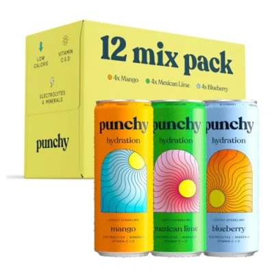 Punchy Drinks Mixed Case of Mango & Blueberry, Everyday Hydration, Lightly Sparkling, Electrolytes, Vitamins, Real Fruit, Support Immunity Muscle Function, Caffeine Free, Low Calorie 12 x 330ml