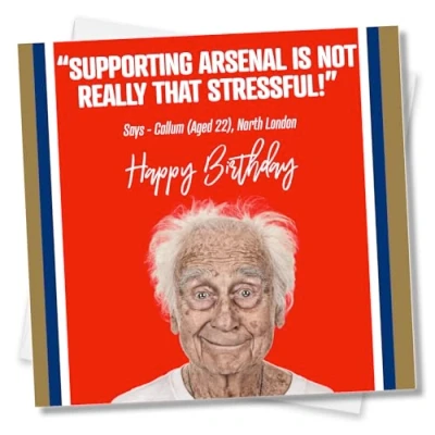Cards Size 145mm x 150mm, printed on 350gsm FSC card, envelope from FSC certified stock, made in the UK Blank inside this Great funny Arsenal birthday card is ideal to send any Arsenal fan. It's the perfect Arsenal birthday cards for men for any soccer football fan is sure to make them smile. Sending a Arsenal card birthday card to that special footy friend, brother, dad shows that you care about them. All Birthday cards from Punkcards are designed, printed and finished in the Jewellery Quarter Birmingham.