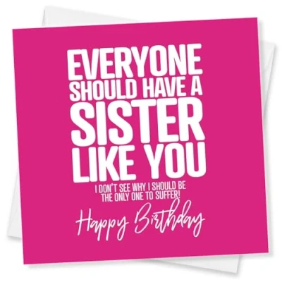 😂 Funny Sister Birthday Card A bold, cheeky design that’s perfect if you’re looking for a sister birthday card funny enough to make her laugh out loud. 🎉 Birthday Card for Sister with Attitude Ideal as a birthday card for sister who appreciates sarcastic humour and sibling banter. 👯♀️ Perfect Sister Card for Adults A popular choice among sister birthday cards for grown-up sisters with a great sense of humour. ✍️ Blank Inside for Your Own Message Leave your own funny, loving or sarcastic message to make this sister card birthday extra personal. 🇬🇧 Quality Card, Made in the UK Square 145mm x 150mm card printed on premium 350gsm FSC-certified card stock, supplied with a white envelope.