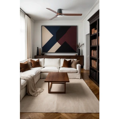 General description PUNT TUB is a stylish black ceiling fan featuring dark wood blades and integrated lighting, perfect for ventilating areas ranging from 13 m² to 17.6 m². It is equipped with a DC motor that offers 6 adjustable speeds and a reverse function for year-round use, enhancing heating efficiency in winter. Technical specifications Voltage: 220-240 V ~ 50/60 Hz Diameter: 130 cm / 51" Housing colour: Matt black Blade colour: Walnut Motor wattage: 5 / 7 / 9 / 13 / 19 / 28 W Revolutions per minute: 90 / 115 / 135 / 158 / 185 / 210 Max. airflow: 177 m³/min / 6318 cfm Ceiling to blades: 13.1 cm / 5.1" Overall drop: 23.3 cm / 9.1" Diameter motor housing: 12 cm / 4.7" Weight: 5.4 kg / 11.9 lbs IP Rating: IP20 Lighting: 18 W LED (included) Luminous flux: 1300 lm Colour temperature: 3000 / 4000 / 6500 K Not dimmable Compatibility and accessories Includes remote control with 6 fan speeds, light on/off, colour temperature adjustment, timer, and running direction control. Installation
