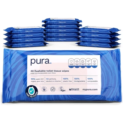 Pura Flushable Moist Toilet Tissue Wipes, 14 x 40 Wipes per pack (560 Wipes) 100% Plastic Free, 99% Water Washlets, Certified Fine to Flush Biodegradable, Compostable, Vegan, Gentle, Clean, Wet
