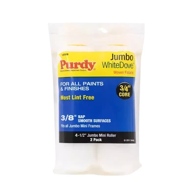 General description This Purdy Jumbo Mini White Dove Sleeve is designed for high-quality paint application, made from woven Dralon® fabric that ensures smooth paint flow and a lint-free finish. The tapered end reduces tram lines, making it ideal for both interior and exterior projects. This pack contains two sleeves, perfect for achieving professional results on walls and ceilings. Technical specifications Product Type: Roller Sleeves Size: 114mm (4.1/2in) Nap Depth: 10mm (3/8in) Core: 19mm (3/4in) Material: Nylon fabric Weight: Approximately 1.0 kg for the pack Pack Quantity: 2 sleeves Compatibility and accessories Compatible with standard roller frames of 4.5-inch size Suitable for use with various roller handles and extension poles Installation Attach the roller sleeve securely onto a compatible roller frame Ensure the sleeve is evenly fitted before use for optimal performance Usage Use with emulsion or gloss paints for smooth, professional finishes Apply with even pressure to