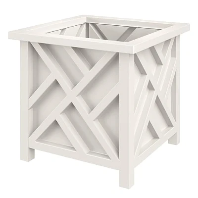 LARGE OUTDOOR PLANTER - This 15.5-inch-square large plant pot is perfect for holding potted plants while providing a decorative cover for growing pots. The elegant lattice design adds a farmhouse-inspired touch to this deck or front porch décor. DURABLE DESIGN - Constructed from durable polypropylene, this square planter features thick, sturdy walls that snap together easily with no tools required, for a lightweight but tough plant box that is designed to stand up to the outdoor elements. OPEN BOTTOM WITH INSERT INCLUDED - The open T-shaped bottom keeps the pot inside elevated from the ground while allowing water drainage. The outdoor flower pot also comes with an optional bottom insert so you can add potting soil directly into the box. STYLISH PATIO DÉCOR - This beautiful white planter is sure to add an elegant look to any outdoor area in all seasons. Place it by your pool, pair with real or artificial topiaries to frame your entryway, or fill with mums for fall front porch décor. PRODUCT DETAILS - Material: Polypropylene Plastic. Dimensions: (L) 15.5” x (W) 15.5” x (H) 16.5"; Interior: (L) 12.3” x (W) 12.3”; Weight: 6.6lbs. Tool-free assembly. Drill holes in bottom insert if more drainage is required. Color: White.