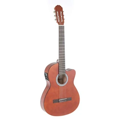 Versatile model: Electro-acoustic concert guitar with 4/4 scale, optionally available as a slim slimbody version (walnut colour) or with a standard body in walnut colour / natural colour / black – ideal for beginners and advanced players. Electronics Included: With bridge piezo pickup, integrated 4-band EQ and built-in tuner for flexible sound control and live performance. Pure Playing Comfort: With cutaway for easy access to high frets, scale length 650 mm and nut width 52 mm for a classic playing feel. Solid Construction: Linden body with ABS edge, fingerboard and bridge made of durable Pakka wood, long-lasting nickel silver frets and chrome-plated tuners. Easy-care Finish: Robust, water-based matte varnish protects the surface and gives the guitar an elegant, modern look.