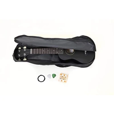 Complete set for beginners: The GEWA Almeria Player Pack includes everything you need to get started – ukulele, gig bag, pitch pipe, spare strings, chord chart, and 2 picks. Light, stable construction: The basswood body with paccawood fingerboard and bridge provides a pleasant playing feel and a clear, balanced sound. Standard size for comfortable play: With a scale length of 350 mm, a nut width of 35 mm, and a total length of 535 mm, the ukulele offers classic soprano dimensions – ideal for beginners of all ages. Reliable mechanics: Open guitar tuners with sturdy metal knobs and black nylon strings allow for easy and stable tuning. Timeless design: The matte black finish gives the ukulele a modern, elegant appearance and simultaneously protects the surface – ideal for musicians who prefer a simple look with style.