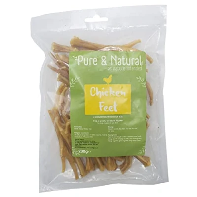 Pure & Natural Dried Chicken Feet Dog Treats Treats, Hypoallergenic, High Protein and Source of Collagen, Crunchy Treat 200g Bag