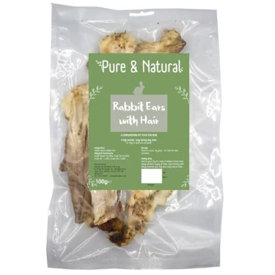 Pure & Natural Rabbit Ears with Fur for Dogs Dog Chews, High Protein, Low Fat, Hypoallergenic Treats All Ages 100g Bag