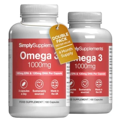 SUPPORTS HEART, BRAIN & VISION HEALTH: Each 1000mg capsule provides high levels of EPA and DHA, contributing to the normal function of the heart, brain, and eyes. All claims are EFSA-approved, making it a trusted omega-3 supplement. HELPS MAINTAIN BLOOD PRESSURE & TRIGLYCERIDES: EPA and DHA contribute to maintaining normal blood pressure and triglyceride levels, supporting overall cardiovascular health and everyday wellbeing. All claims are substantiated by the European Food Safety Authority (EFSA). SUSTAINABLY SOURCED FISH OIL: Responsibly harvested from the pristine Southern Pacific Ocean, delivering a purified, premium-quality source of omega-3 fatty acids. MOLECULARLY DISTILLED FOR PURITY & FRESHNESS: Advanced molecular distillation removes contaminants, ensuring each capsule delivers clean, fresh, and effective omega-3. 360 EASY-TO-SWALLOW CAPSULES – 4-MONTH SUPPLY – UK MADE: With a recommended dose of 3 capsules per day, this high-strength Omega-3 supplement provides a convenient, long-lasting supply. Manufactured in the UK to strict GMP standards, it supports your daily nutritional routine and overall wellbeing.