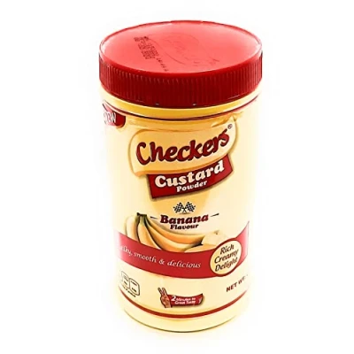 Product of Nigeria. 2 Minutes to Great Taste. Rich Creamy Delight. Silky, Smooth & Delicious. Checkers Custard Powder you can Serve with akara & milk, moimoi & milk, Fruits & Cakes and Steamed & Bake Pudding. Custard Powder is often mixed with ingredients to make cakes such as banana bread, chips, cakes. Custard you can use as a sauce poured over Jellies.