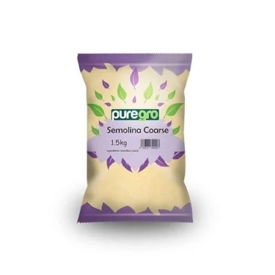Puregro Semolina (Semoule) Coarse 1.5kg Suitable for Vegetarians Naturally low in fat Puregro Semolina Fine is made from the finest quality freshly milled Durum Wheat and adds a delicious crunchy texture to many cakes and biscuits when baking Semolina is traditionally used for puddings, pasta and many varieties of Indian Sweets A Premium Quality Product by Puregro