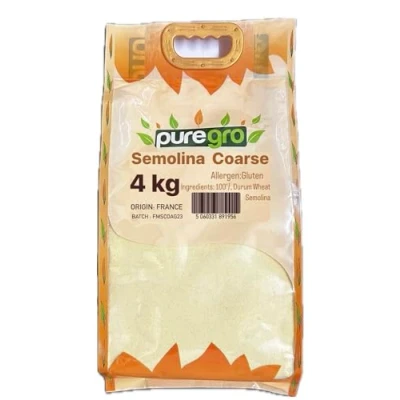 4kg Easy to Carry Bag Naturally low in fat Semolina is traditionally used for puddings, pasta and many varieties of Indian Sweets. Puregro Semolina Coarse is made from the finest quality freshly milled Durum Wheat and adds a delicious crunchy texture to many cakes and biscuits when baking. Suitable for Vegetarians.
