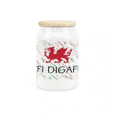 This patriotic red & green ceramic coffi digaffein storage container would be a lovely addition to any kitchen! Featuring the bold red Welsh dragon on the front, the canister is perfect for day to day use, or as a keepsake souvenir for celebrating your Welsh pride! White ceramic with a wooden lid Perfect as a gift or for everyday use Canisters available in the range - Tea, coffee, sugar & more! 600ml capacity (approx), 9.5cm (dia) x 14.5cm (h)