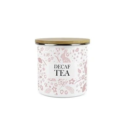 This sturdy medium sized enamel decaf tea container is a stunning yet practical addition to any kitchen! Featuring a beautiful pink rabbits design, playing amongst flowers and leaves. Durable enamel with a bamboo lid Perfect as a gift or for everyday use Canisters available in the range - Tea, coffee, sugar, decaf and more! 600ml capacity (approx), 11cm (dia) x 11cm (h), Weight: 0.8487797087 Pounds, Manufacturer: Purely Home