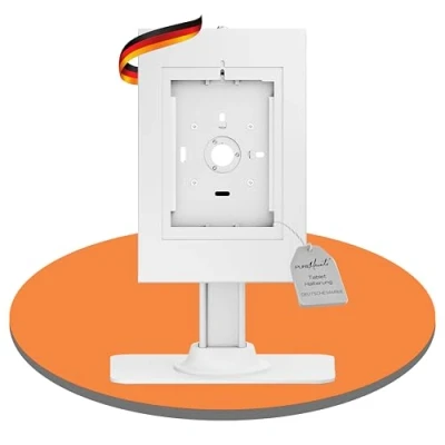 Lockable and anti-theft tablet case for iPad 5/6/7/8/9/ iPad Air 9.7"/ 10.5"/10.9"/ iPad Air 9.7"/10.5"/11" as well as Samsung Tab A 10.1 (2019)/ Tab A7/ S6 Lite 10.4" Rotatable housing for vertical (portrait) or horizontal (landscape) orientation - can be attached directly to the wall or via VESA 75 x 75 mount The tablet holder from PureMounts is made of powder-coated steel in white, making the holder extremely stable and very durable. Cut-outs for access to all controls + camera and power connection - Rear cable management for a tidy appearance Thanks to the instruction manual included in the packaging, the attachment of the tablet holder is extremely easy and is possible for anyone without much effort.