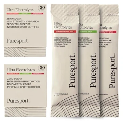 Puresport Ultra Electrolytes Hydration Variety Pack (60 Pack) Watermelon, Citrus & Raspberry Salt/20 Electrolyte Sachets of Each Sugar Free Powder Optimise Hydration/Support Muscles