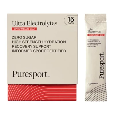π¦ππππ‘π§ππππππππ¬ ππ’π₯π π¨πππ§ππ πππππ§π₯π’ππ¬π§π π¦π’ππ¨π§ππ’π‘: Each single-serve electrolyte sachet comes with a balanced combination of sodium, potassium, magnesium, and calcium. This electrolyte drink replenishes essential minerals lost through sweat during exercise. The ideal rehydration replacement supplement formula for training, performance, or recovery. πͺππ¬ πͺπ π πππ π§πππ¦ π£π₯π’ππ¨ππ§: Hydration is crucial for maintaining performance, particularly during intense or prolonged physical activity. Electrolytes are essential to prevent dehydration and muscle cramps, common issues in endurance sports. Ultra Electrolytes is designed to keep athletes hydrated, improve endurance, and support muscle function with a refreshing Watermelon formula in convenient zero-sugar electrolyte Hydration powder sachets. We created these rehydration sachets so you can stay health-focused whether you're training, travelling, or recovering. πͺππ’ ππ¦ π§πππ¦ π£π₯π’ππ¨ππ§ ππ’π₯? For active individuals seeking peak performance and rapid hydration even under challenging conditions. Puresport Ultra electrolyte supplement hydration sachet supports rapid rehydration, prevents muscle fatigue naturally, and works whether youβre in the gym, on the road, or in the heat. ππ’πͺ π§π’ π§πππ: Mix one sachet of Ultra Electrolytes with 500ml of water 30 minutes before exercise for optimal hydration. During prolonged or high-intensity activities, an additional sachet may be consumed to replace electrolytes lost through sweat. No scoops, no mess, just convenient, travel-friendly sachets with a precise dose. Most users feel increased hydration and energy within 30 to 60 minutes. With consistent daily use, especially around intense workouts or endurance training, youβll notice enhanced performance, recovery, and overall electrolyte balance within about one week. π’π¨π₯ π ππ¦π¦ππ’π‘: We're building a movement that encourages people to commit to a long-term, sustainable approach to wellbeing. At the core of Puresport is three unwavering pillars: fuelling the body with natural, effective products, staying active through movement, and building meaningful connections within the community. Informed Sport Certified and trusted by the world's top athletes, we manufacture the highest-quality, natural supplements to help you hydrate, perform and recover your best, for the Long Run.