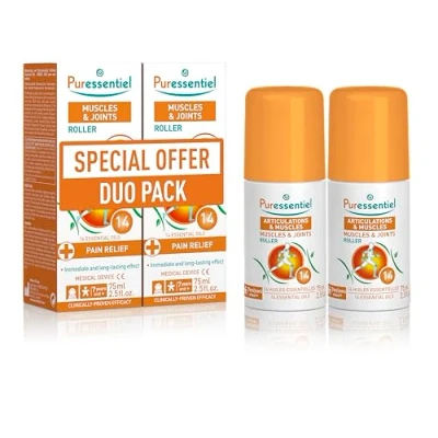 SPECIAL DUO OFFER: a twin pack of Puressentiel best-selling Muscles & Joints Roll-On. MUSCLE & JOINT RELIEF: A medical device providing fast relief for muscle & joint pains & aches. Relaxes and soothes muscles and is ideal for massaging sensitive areas such as the back for lower back pain relief, neck pain relief, shoulders, elbows, wrists, hands, hips, knees, thighs, calves, ankles, feet & general muscle pain. MASSAGE ROLLER BALL: The roller ball performs a soothing acupressure & muscle rub effect by massaging painful areas for relaxation & muscle pain relief. You can always use more of the product and finish with a traditional massage. TESTED EFFICACY: 93%, long lasting calming relief: 88%, more supple movements. 98.45% user satisfaction. Perfect for lower back pain relief, neck pain relief and general muscle pain releif. 100% NATURAL ACTIVE INGREDIENTS: 14 essential oils (cajeput, scot's pine, wintergreen, rosemary cineole, nutmeg, peppermint, spike lavender, niaouli, eucalyptus globulus, juniper, marjoram, roman chamomile, turpentine) dye-free, preservative-free, no artificial fragrance and no mineral oils. NO MESS: Our Muscles & Joints Roller is small and lightweight, which makes it easy to travel with and carry. Due to its inbuilt roller ball, you can use it for fast application with soothing muscle pain relief. HOW TO USE: Shake the roller well before applying to painful muscles or joints (back, neck, shoulders, elbows, wrists, hands, hips, knees, thighs, calves, ankles, feet etc.) three times per day. The massage roller ball is ideal for massaging painful areas to help soothe muscle aches and pains. Made in France