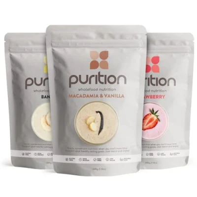 Purition Large Bag Multipack Strawberry, Banana & Macadamia Vanilla Premium High Protein Powder for Keto Shakes and Smoothies with Natural Ingredients Weight Management 3 x 12 Meal Bags