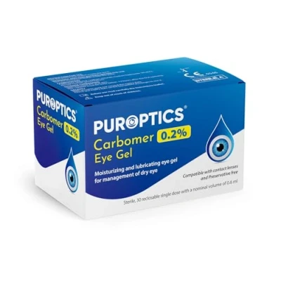 PUROPTICS Carbomer 0.2% Eye Gel compensates for tear insufficiency relieves the symptoms of irritation linked with dry eye syndromes and protects the cornea against the drying out. PUROPTICS Carbomer 0.2% Eye Gel forms a lubricating film which prolonged contact time: the gel remains on the surface of the eye for longer than low viscosity artificial tears and hence less frequent application is required. Therefore PUROPTICS" Carbomer 0.2% Eye Gel perform a moisturizing and lubricating action on the ocular surface and give a temporary relief of burning and irritation. PUROPTICS Carbomer 0.2% Eye Gel can be used by contact lens wearers Administer the product before wearing contact lenses. PUROPTICS Carbomer 0.2% Eye Gel is indicated for the relief of dry eye symptoms, moderate form, due to both extrinsic and intrinsic causes such as: Environment and unfavourable weather conditions such as the use of air conditioning (in the car, in the office, at home), strong wind, air pollution and very hot weather, Incorrect use of contact lenses, of any type, worn for many hours during the day, Dry eye due to allergies and conjunctivitis, Prolonged use of the computer or for prolonged driving.