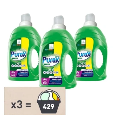 Universal Application – Purox Universal Liquid Gel, ideal for washing coloured and white textiles, suitable for both hand and machine washing. Effective Protection – This product effectively removes moderate and light dirt while protecting your washing machine from limescale buildup. Easy Rinsing – The modern formula dissolves completely in water, leaving no residue on fabrics or in the washing machine dispenser. Eco-Friendly Choice – The product is phosphate-free, environmentally friendly, and biodegradable. Efficiency – 3 packs of 4.3 l washing gel are enough for a total of 429 washes.