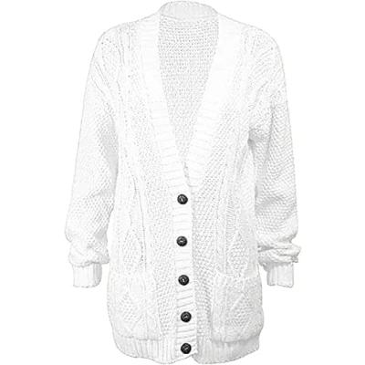 Purple Hanger New Women’s Ladies Long Sleeve Button, Front Pocket Chunky Aran Cable Knit Grandad Cardigan, Sweater Plus Size 8 26 (UK, Numeric, 8, 10, Regular, White)