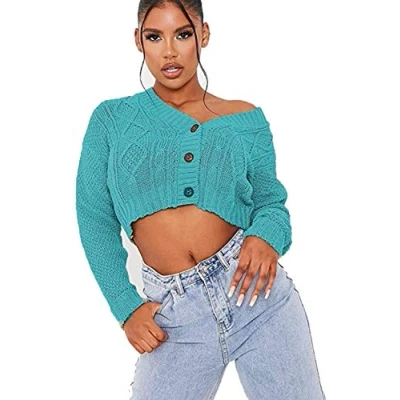 Purple Hanger New Womens Everyday Long Sleeve Button Top Ladies Chunky Aran Cable Knit Grandad Cardigan (Crop Turquoise, Numeric_12)