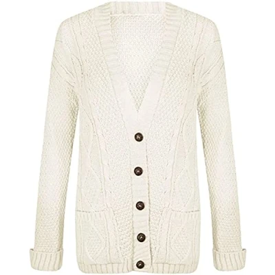Purple Hanger New Womens Everyday Long Sleeve Button Top Ladies Chunky Aran Cable Knit Grandad Cardigan (UK, Numeric, 8, 10, Regular, Cream)