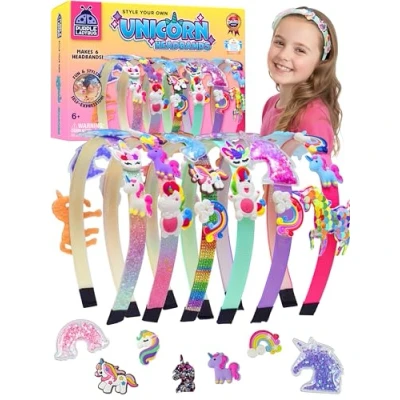 Encourages Creative Play and Personalisation: This unicorn headband kit helps children explore their creativity while designing accessories they can proudly wear or share. A hands-on way to boost self-expression, imagination, and decision-making. Complete Craft Kit: Set contains 6 satin-covered headbands, 3 glittery decorative fabric strips, 3 double-sided adhesive tapes, 40 colourful unicorn-themed charms, 48 glue dots, and step-by-step instructions. No additional tools required, just open and start crafting. Ideal Gift for Girls - Christmas, Easter & More: Perfect as Christmas gifts for kids, stocking fillers, Easter gifts for girls, or birthday surprises. A unique and thoughtful present that combines fun with creativity, suitable for girls aged 4 to 9. Supports Skill Development Through Crafting: Assembling the headbands helps improve fine motor skills, hand-eye coordination, and focus. Children learn to follow instructions, plan their designs, and complete wearable accessories they can be proud of. Safe, Mess-Free, and Easy to Use: All materials are non-toxic and safe for kids, with pre-cut fabrics and mess-free glue dots for clean, stress-free setup. Designed for independent crafting or shared family activity time., Manufacturer: PURPLE LADYBUG