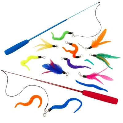 🐾 Complete Play Set: Includes 2 high-quality wand handles (blue & red) and 10 colorful refill attachments (feathers and worms). 🎯 Interactive Fun: Encourages healthy activity, improves agility, and strengthens the bond between you and your cat. 🔄 Easy Clip-On Design: Quick-swap metal clips let you change attachments in seconds to keep playtime fresh. 💪 Durable & Safe Materials: Made from pet-safe materials that are tough enough for energetic play. 🏠 Ideal for Indoor Cats: Stimulates your cat's natural instincts without needing to go outdoors..