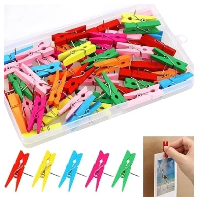 Push Pins with Wooden Clips 50PCS Pegs Pushpins, Multicoloured Drawing for Cork Boards Notes Photos Display Wall